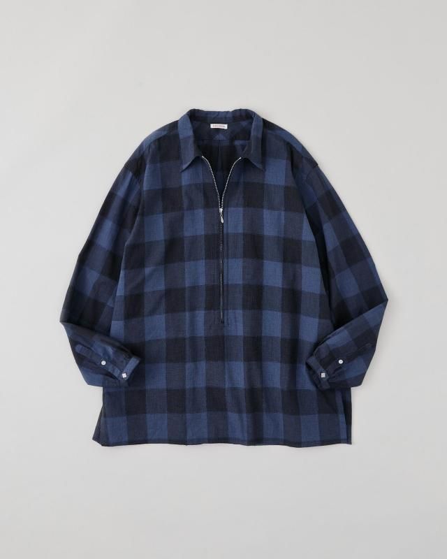 既に閉鎖してしまったイタリアのシャツ地メーカーから多彩なデッドストック生地を入手し作り出したロングジッププルオーバーシャツです。1940年代のドレスシャツのパターン構成をリファレンスとして取り入れ、一枚でもカジュアルに着られるように再設計されたデザインです。製糸からフィニッシングまで全工程を自社工場で行う数少ないメーカーのひとつだったため、現在ではこの様な手の込んだ生地を作ることは中々難しいと言われています。デッドストックならではの生地感や多彩な構成を是非体験していただきたいです。