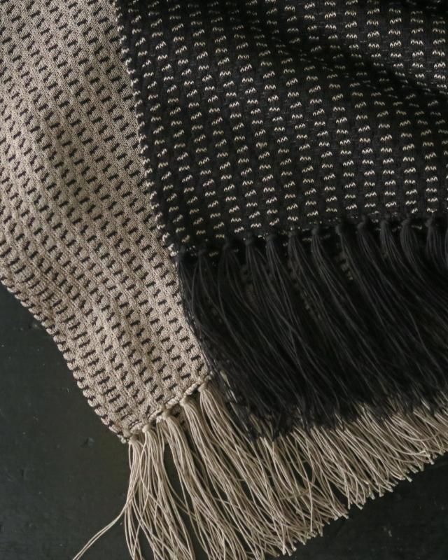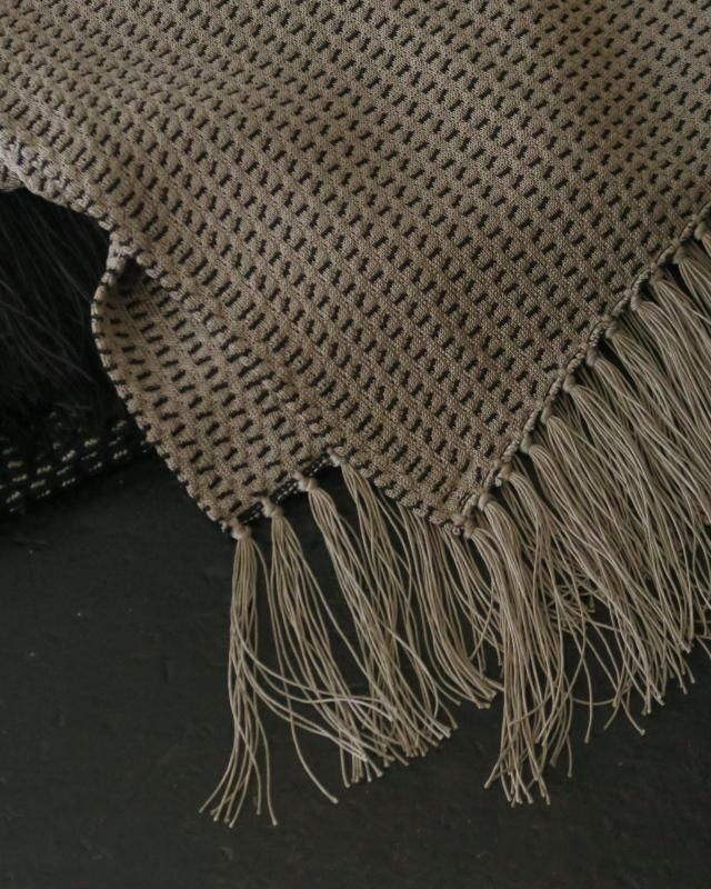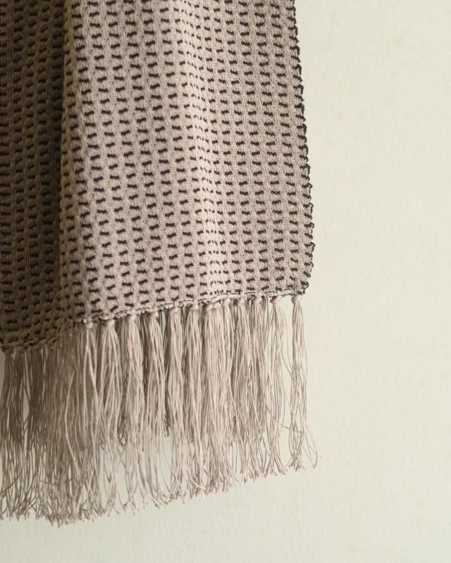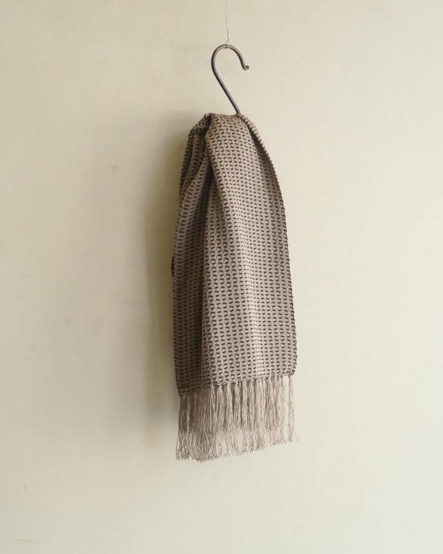 1920年代に作られたと思われるシルクジャガードのスカーフがベース。スカーフは当時のスタイリングには欠かせないアイテムでした。ジャガードの組織を研究しシルク100%の糸で完全再現されています。T.T オリジナルで作成した撚り糸を1本1本丁寧に手付けしたフリンジが付いています。細めの幅に仕立て、ジャケットの下に重ねるスタイリングを提案しています。