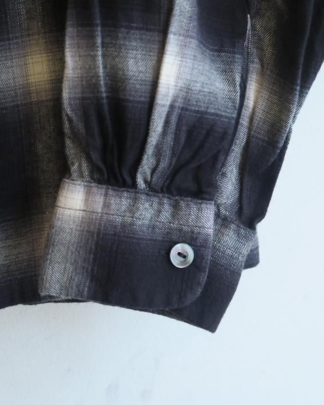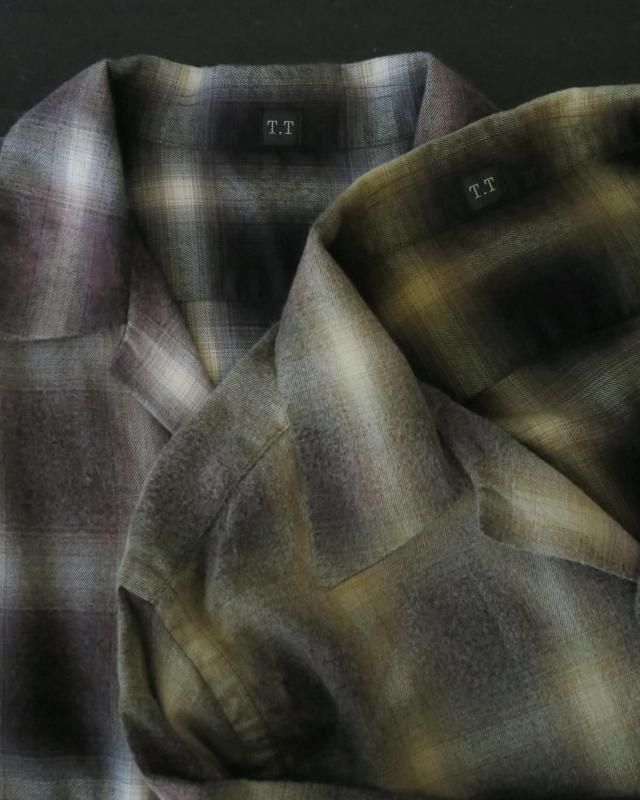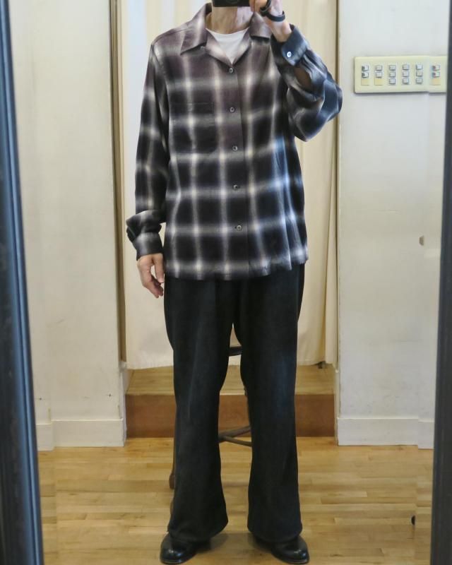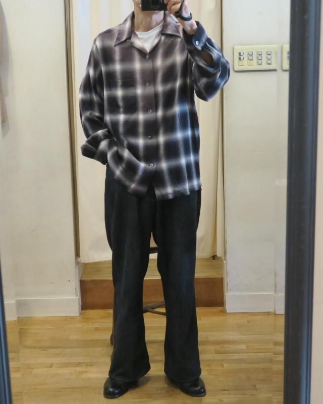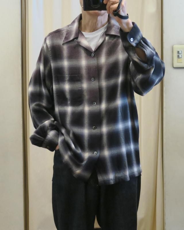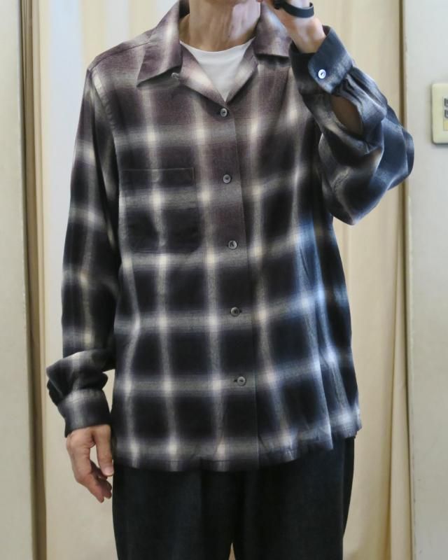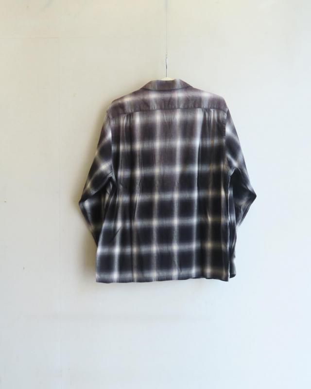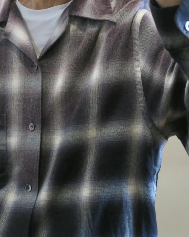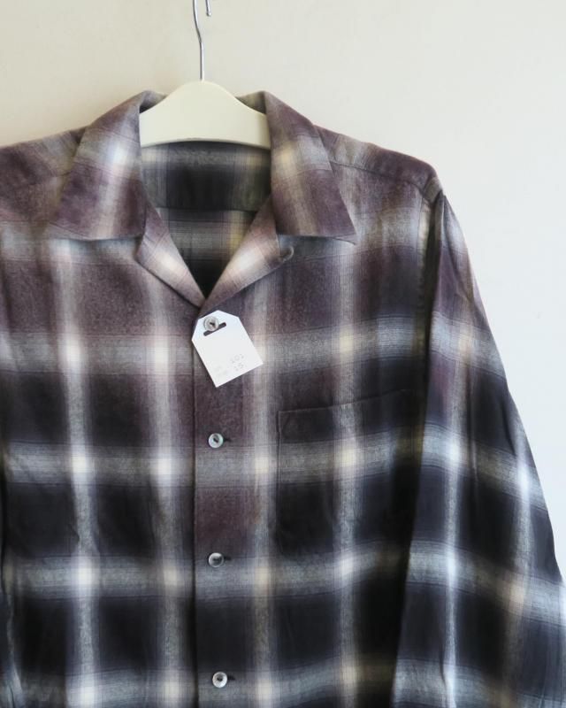 1950年代のアメリカ製のシャツがベースのオープンカラーシャツ。見頃はややゆったりとし、タックインできる丈感のシルエットになります。シルエットを生かすため、落ち感のあるレーヨン混のオンブレーチェックを使用。表面に起毛加工を施すことで薄手でありながら温かみのある素材に仕上がっています。*ブリーチ加工を施し、経年変化で色落ちしたようなユーズド感が演出されたシャツです。